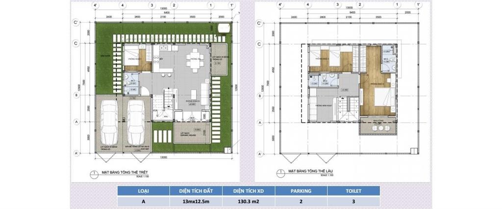 - Loại A: 55 căn, 130,3m2 ( 13m x 12,5m); gồm 3 phòng ngủ, 1 phòng khách và 3 WC.