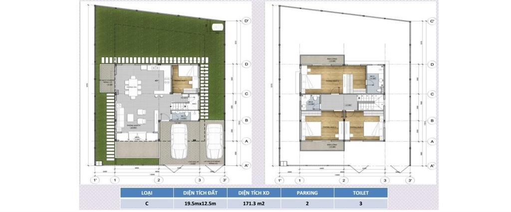 - LOẠI C: 15 căn, 171,3m2 ( 13m x 20m); 4 phòng ngủ, 1 phòng khách và 3 WC.