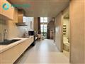 Tầng dưới: Phòng khách + bếp full nội thất, WC riêng, khu làm việc/ăn uống cạnh cửa kính.
