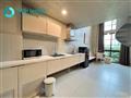 Bếp đầy đủ tiện nghi: Bồn rửa lớn, bếp điện, hút mùi, tủ bếp rộng, bàn ăn.
